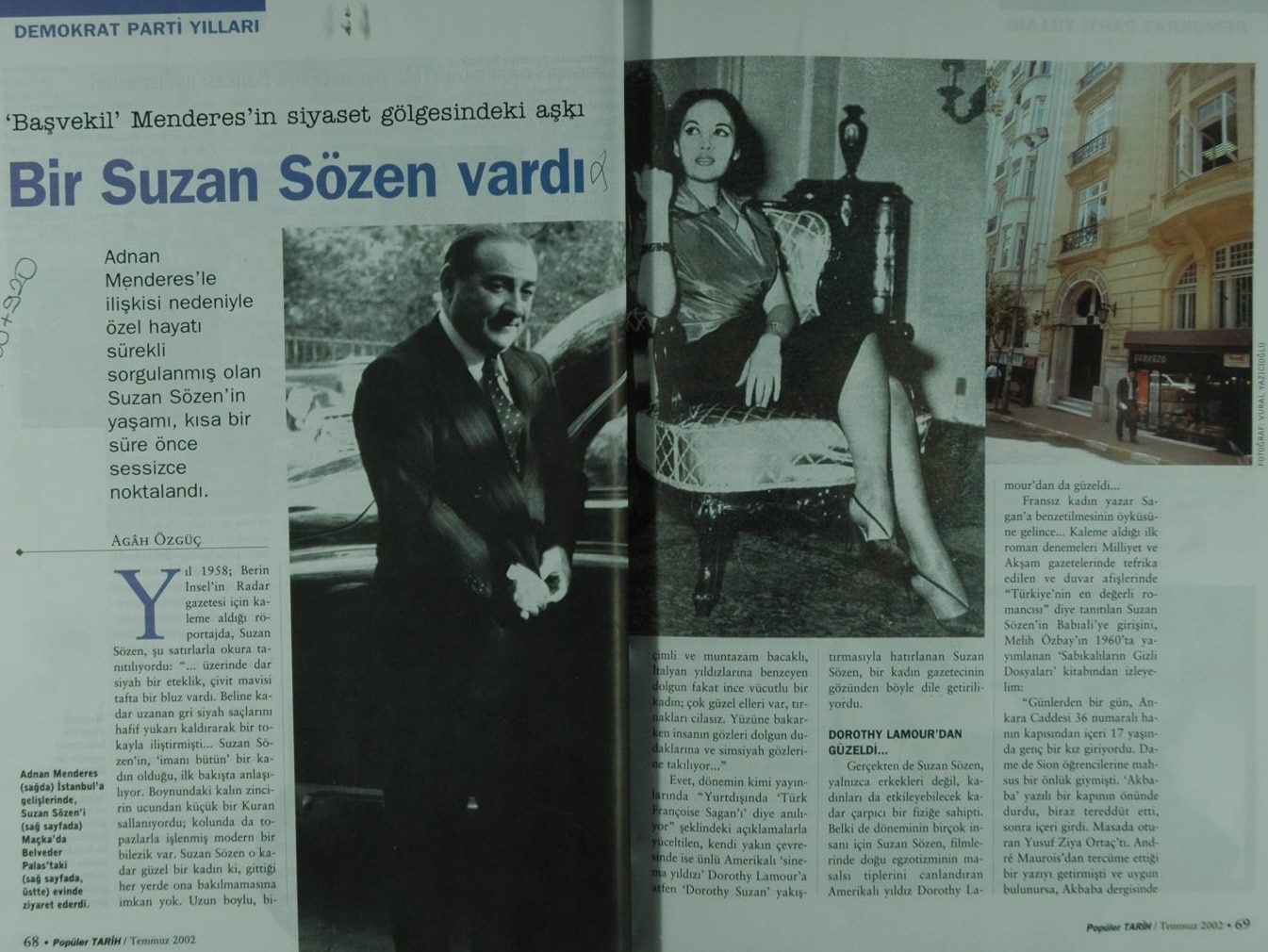Evet bunu da sordum elbette ki… Bana dediği şuydu: “O zamanlar oralarda bir yerde bir apartman yapmıştık, ben küçük bir hissedardım. Aynı zamanda inşaatın kalfasıydım. Bizim yaptığımız inşaatta Adnan Menderes, Suzan Sözen’in bir akrabasına, kardeşi mi, kuzeni mi nedir, bir daire almıştı… Menderes de o bina yapılırken, bitmeye yakın iki defa inşaatı ziyarete geldi” O dönemlerde de inşaat yapılmıyor ki İstanbul’da… Belki de yapılan inşaat sayısı on taneden fazla değildir koca şehirde… Başbakan’ın da zaten bu günkü kadar yoğun birşeyi yok ki, zamanı oldu herhalde… Bir de sevgilisinin akrabasının inşaatını ziyaret gelmiş. Dedim ki, “Hepsi bu kadar mı?” Babam da, “Hepsi bu kadar. Ondan sonra da ne oldu bilmiyorum” dedi.
