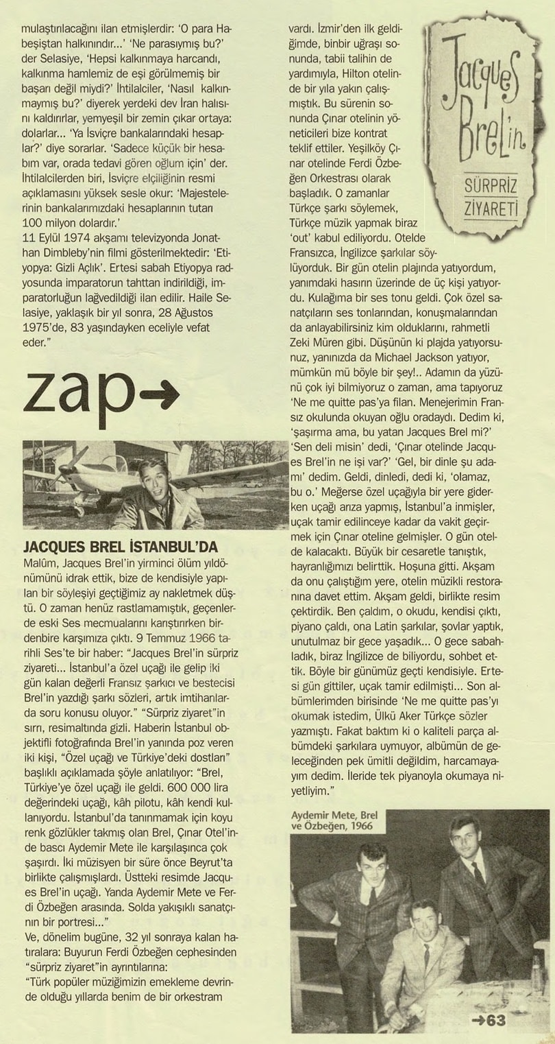 Başka bir sayfadan satır arası, “Galatarasaraylı futbolcu Gökmen Özdenak, o cıvıl cıvıl yaz günlerini, Çınar Otel’de müzik yapan Ferdi Özbeğen’i, dibindeki taşlar bile görünen denize dalıp düşen kolyeleri çıkarmalarını unutamıyor”.