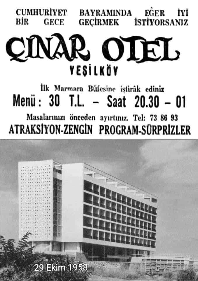 Bir Yeşilköy dergisinin, 80’lerde çıktığını düşündüğüm sayısından alıntıyla: “Çınar Otel kurulduğu günden beri Yeşilköy’ün simgesi. Haydar Çınar’ın Yeşilköy’de yapımına başladığı oteli, Tevfik Ercan satın almış.