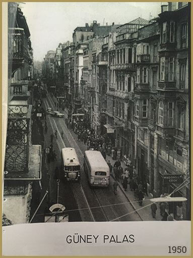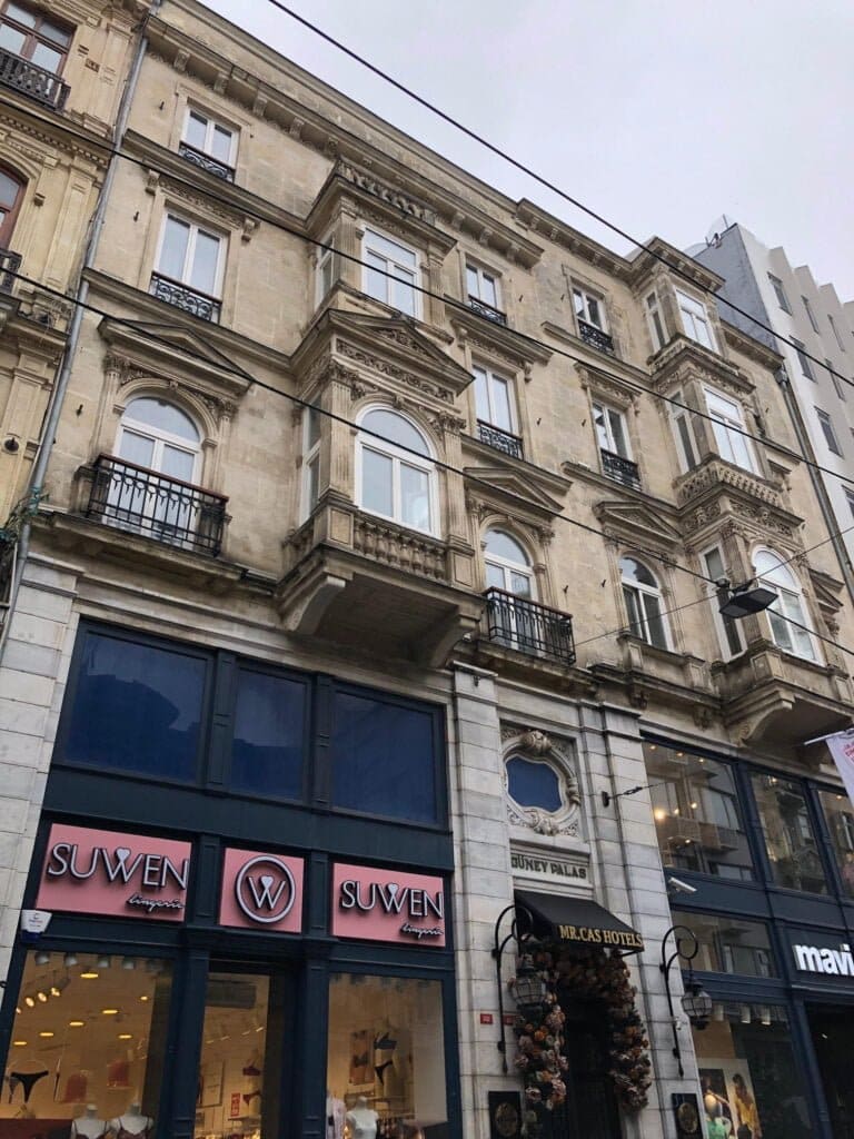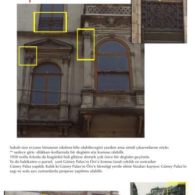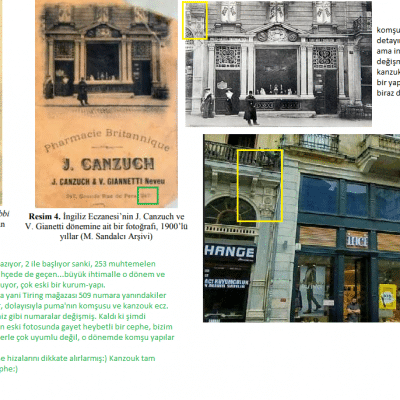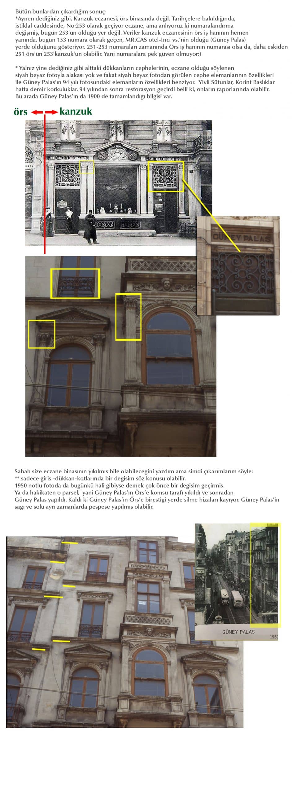 Ama “İngiliz Eczanesi” olanak da bilinen Kanzuk meşhurdu ve pek çok kaynakta özellikle “Çiçek Pasajı’nın karşısında” şeklinde adres veriliyordu. Önce Google haritalardan taradım, ardından gittim baktım alakası yok. Pek çok kaynakta, yine Çiçek Pasajı’nın karşısında kalan “ÖRS” yazılı binanın eski eczanenin binası olduğu yanılgısını gördüm. Bu bir kere yazıldığı için kopyalana kopyalana da kaynak haline gelmişti. Ancak fotoğrafın -karşıdan bakınca- solunda kalan sutun hâlâ duruyordu ve asıl o ÖRS binası idi, bence. Yani Kanzuk, bugün MR. Cas Hotel adını almış Güney Palas’ın altında olmalıydı.